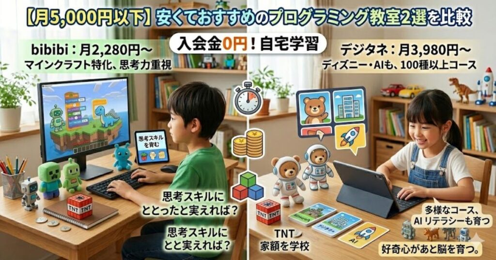 この記事では、月5,000円以下で始められるbibibiとデジタネの違いを、料金や教材、お子さんの性格との相性の観点から比較してきました。